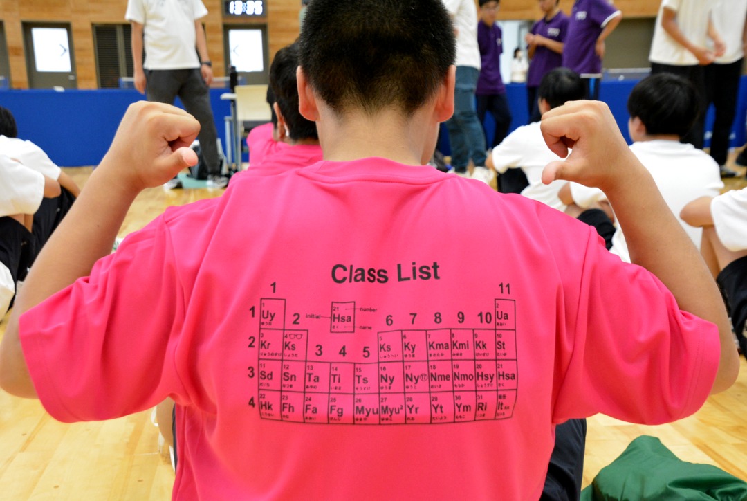 次年度のクラス替えに備え『科』で統一したクラス、元素の周期表を利用したクラス、個人のイニシャルを書いたクラス、担任の先生の顔をイラスト風にしたクラス、どのクラスのデザインも個性が表れていて、クラスの一体感を感じました。