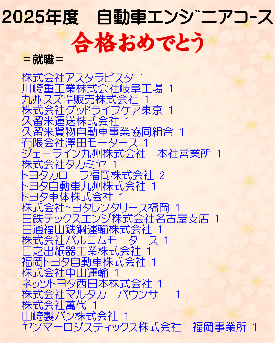 2025年度 自動車エンジニアコース3年生の進路です。