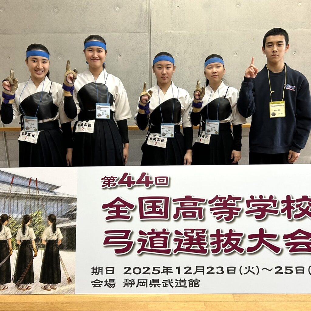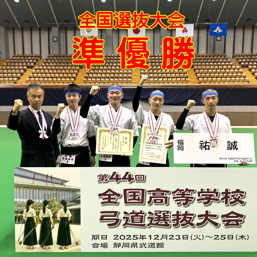 12月23日から行われた 第44回 全国高等学校弓道選抜大会(静岡県藤枝市)に男子団体・女子団体・男子個人の部で出場し、男子団体の部で準優勝しました。弓道部のみなさん、おめでとうございます!