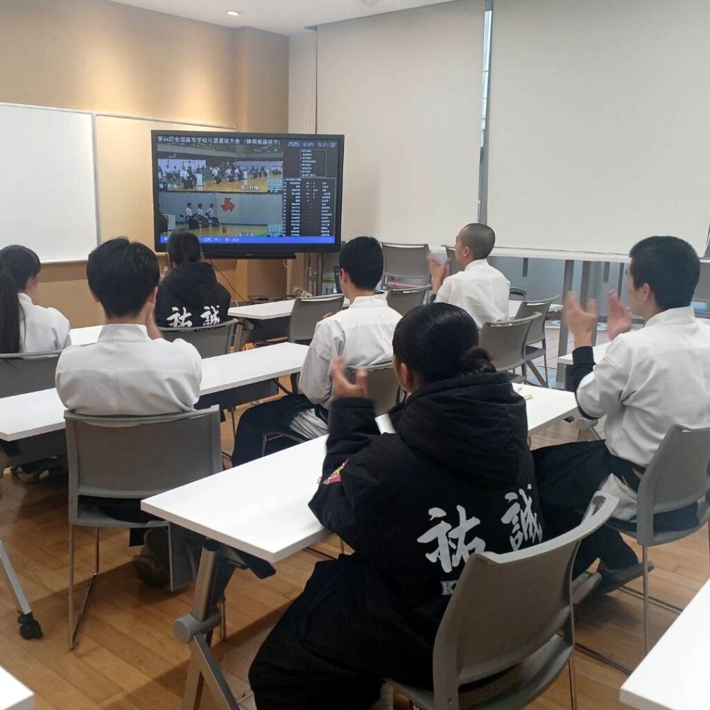 学校では、先生方や福岡に残った弓道部がLIVE配信を見ながら応援をしました。