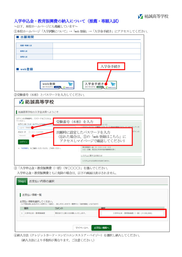 (入学申込金・教育振興費ともに免除の方は、手続きの必要がありません。3月10日(火)の入学者説明会にご参加ください。)