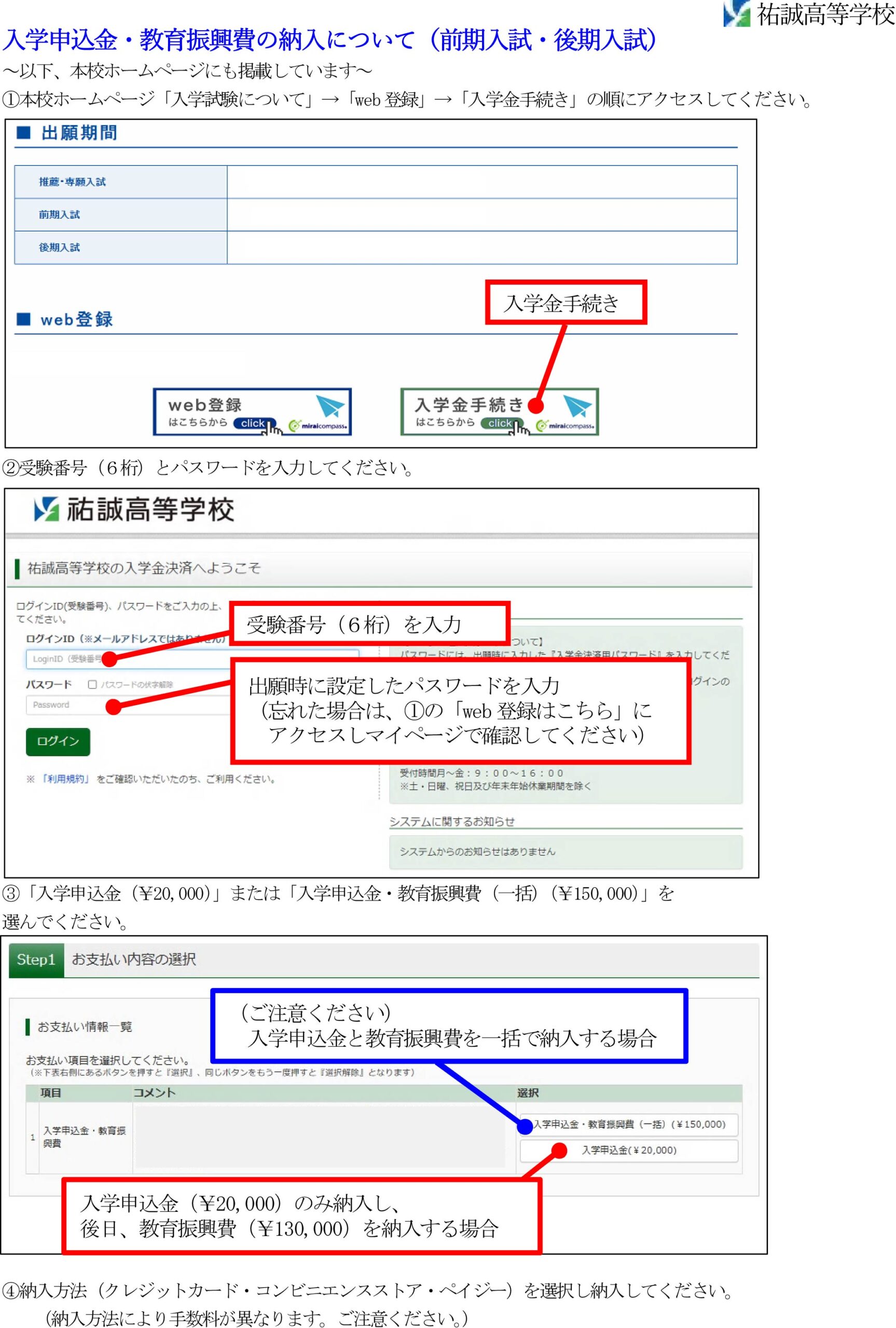 (入学金手続き専用パスワードの確認手順)