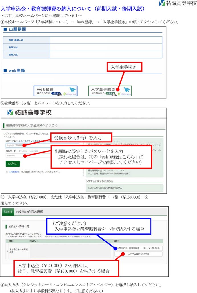 入学金手続き:以下のサイトにアクセスしてください。