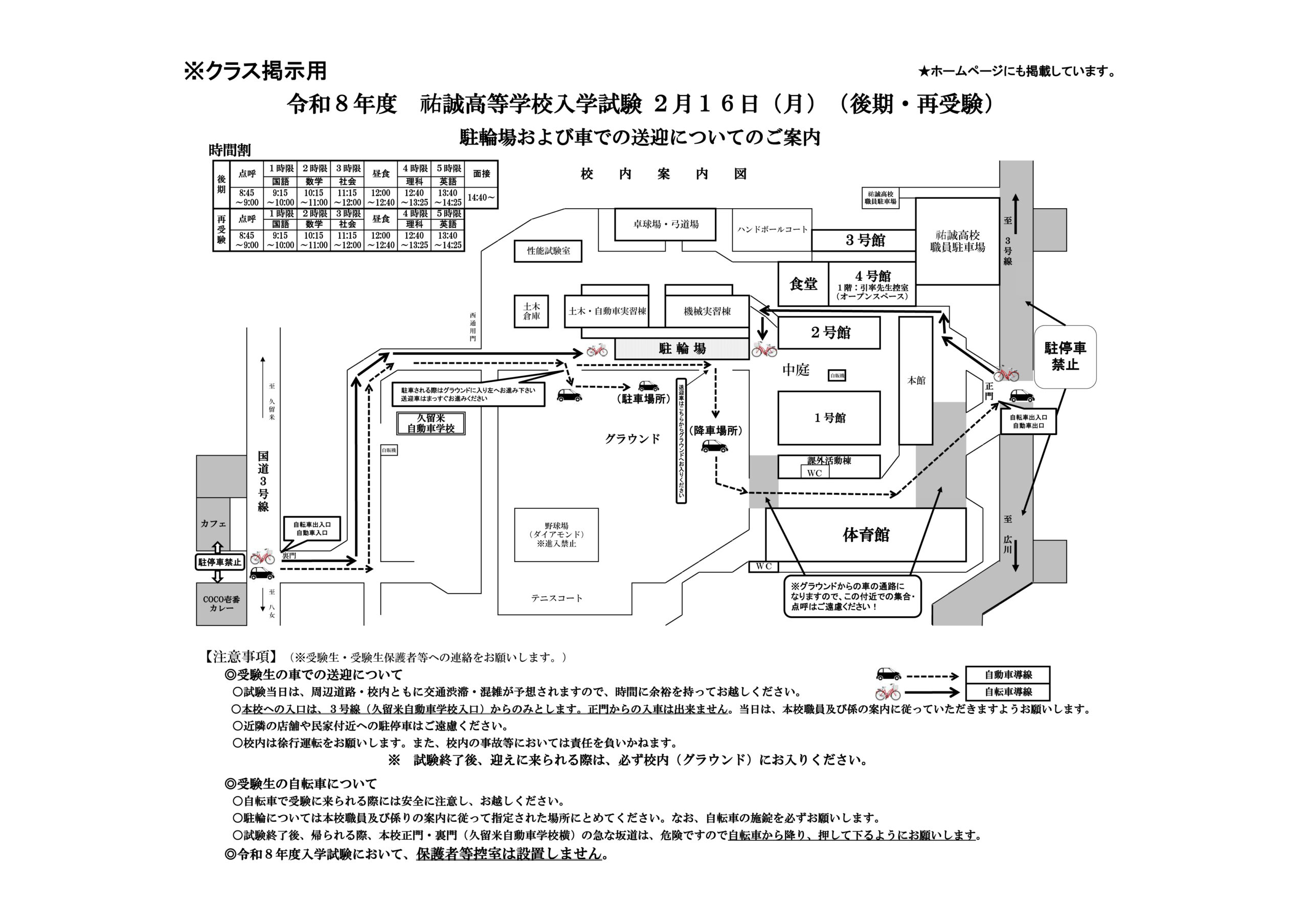 新着情報NEWS 1月28日更新 【一般後期入試 最新情報】 2026.01.28 【一般後期入試 最新情報】 1月28日(水)更新 一般後期入試および一般前期入試の調査書受付期間が始まりました。 以下、受験上の注意等を掲載しております。 ご確認をお願いいたします。 受験上の注意(前期後期).pdf 駐輪場および車での送迎について(後期).pdf 前へ 新着情報一覧へ戻る 次へ