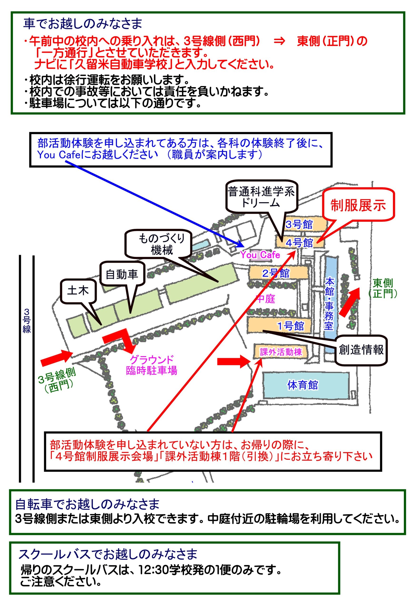 当日の朝は、校内を一方通行としております。必ず3号線側から入校をお願いいたします。
