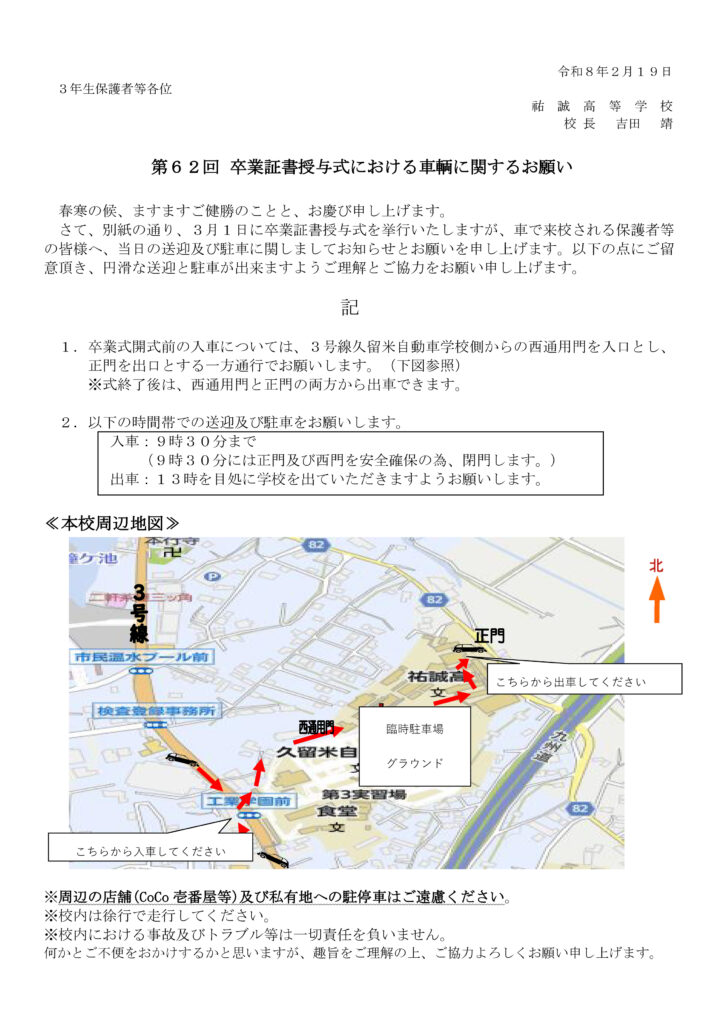 新着情報NEWS 第62回卒業証書授与式にお越しの保護者等のみなさまへ 2026.02.19 3年生の保護者等のみなさまにご連絡いたします。 先日、文書にてお伝えしておりましたが、3月1日(日)に卒業証書授与式を挙行いたします。 当日、車で来校される場合は、 ①3号線久留米自動車学校側からの西通用門を入口とし、正門を出口とする一方通行でお願いします。(下図参照) ②入車は9:30まで(9:30には正門及び西門を安全確保の為、閉門します)、式終了後は13:00を目途に出車していただきますようお願いいたします。 前へ 新着情報一覧へ戻る